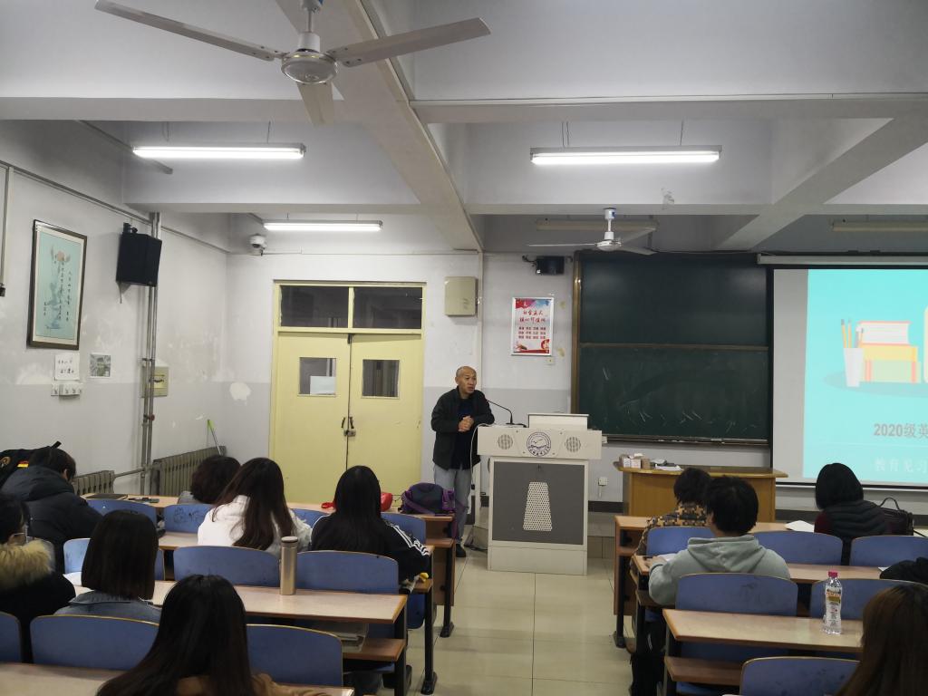 2021年11月15日8:30,sunbet申搏官方网站在综合楼118召开了2020级英语专业教育见习动员大会。sunbet申搏官方网站崔海英院长、罗学锋副院长、范学荣副院长、英语教学部主任王静、宋洁、部分指导教师以及2020级131位同学参加了本次大会。
