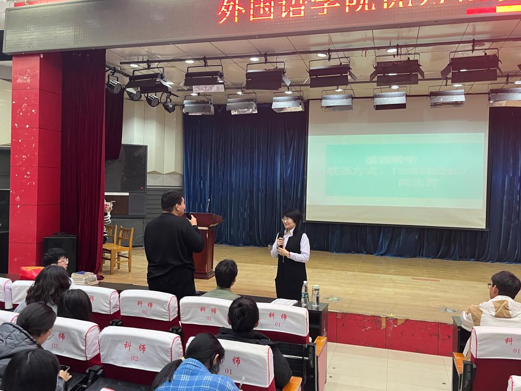 “雏既壮而能飞兮,乃衔食而反哺”。为进一步提升学生专业能力和综合素养,秉承“外语+”应用型人才培养理念,充分体现外语的“学以致用”原则,提升学生用外语“讲好中国故事”的意识和能力,增强文化自信,sunbet申搏官方网站于11月8日邀请优秀校友尚志芹(河北建材职业技术学院副教授、对外汉语教学国际汉语高级教师、国家高级英文导游员、河北省英语导游考官、河北省“师德标兵”、全国第十三批援藏导游员西藏自治区“先进个人”)在开发区校区综合楼二楼报告厅进行针对教师资格证和外语导游考试的讲座。
