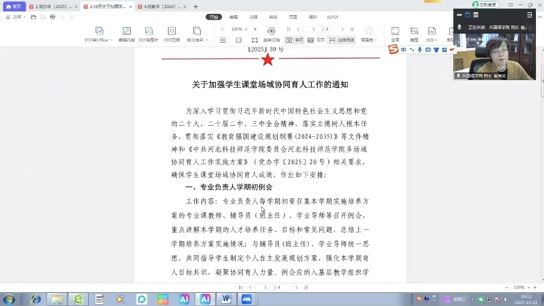 2025年10月22日晚,sunbet申搏官方网站组织召开线上专题工作会议,重点学习《多场域协同育人工作实施方案》(〔党办字 25〕 20号)、《关于加强学生课堂场域协同育人工作的通知》(〔2025〕59 号)、《本科生学业导师管理办法 》(校教字〔2024〕 25号)等文件。会议由崔海英院长主持,学院领导班子成员、教学部主任及专业负责人参加。