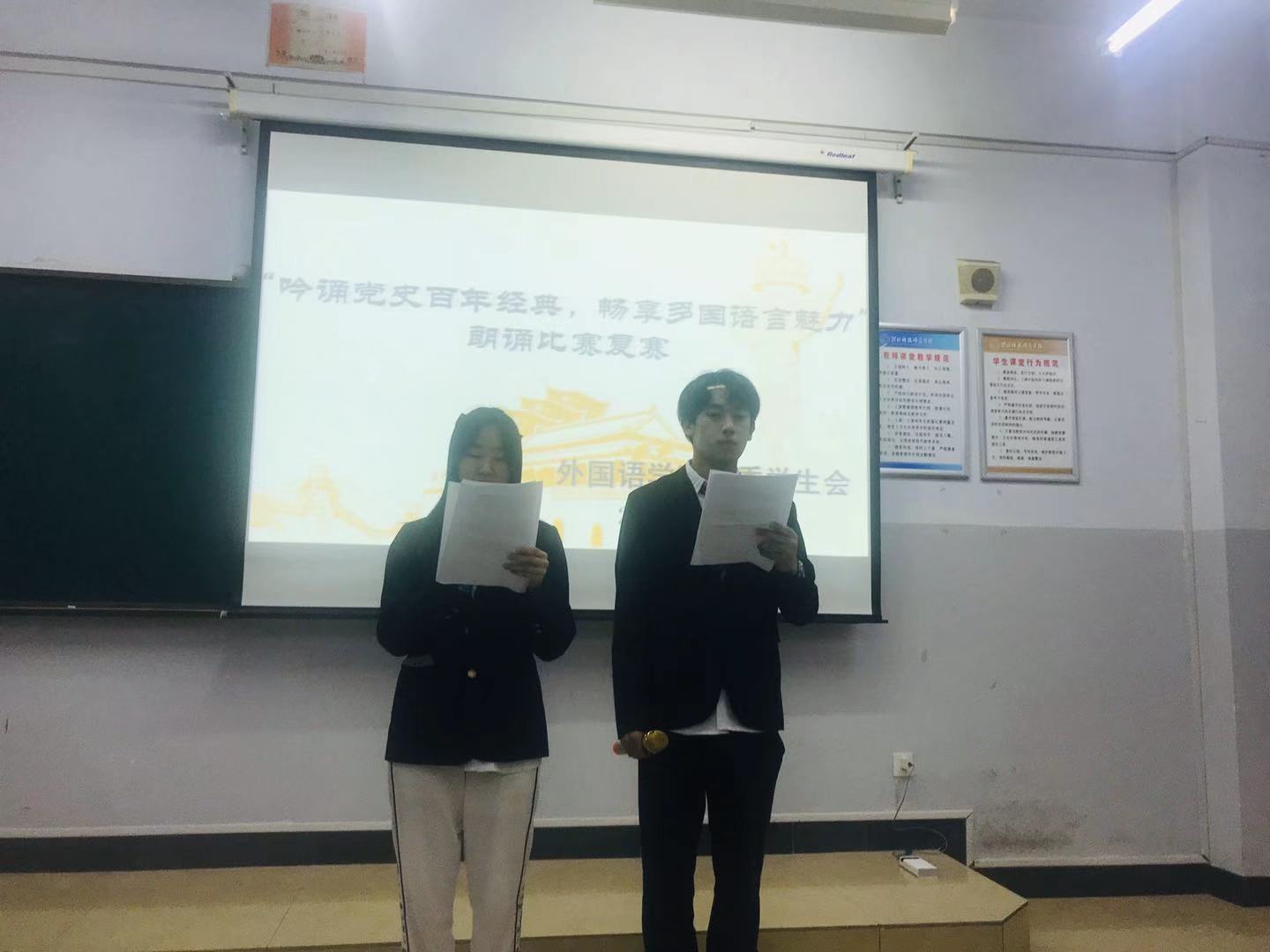 4月28日晚上6点半,sunbet申搏官方网站在406举办“吟诵党史百年经典,畅享多国语言魅力”外文朗诵大赛。进入决赛的20组选手用激昂高亢的声音、浓浓的爱党爱国之情,通过声声诵读传递党的“好声音”。本次比赛采取线下及线上抖音直播相结合的形式开展。学院党委书记、团委负责人、学工办副主任、各语种专业教师担任评委。