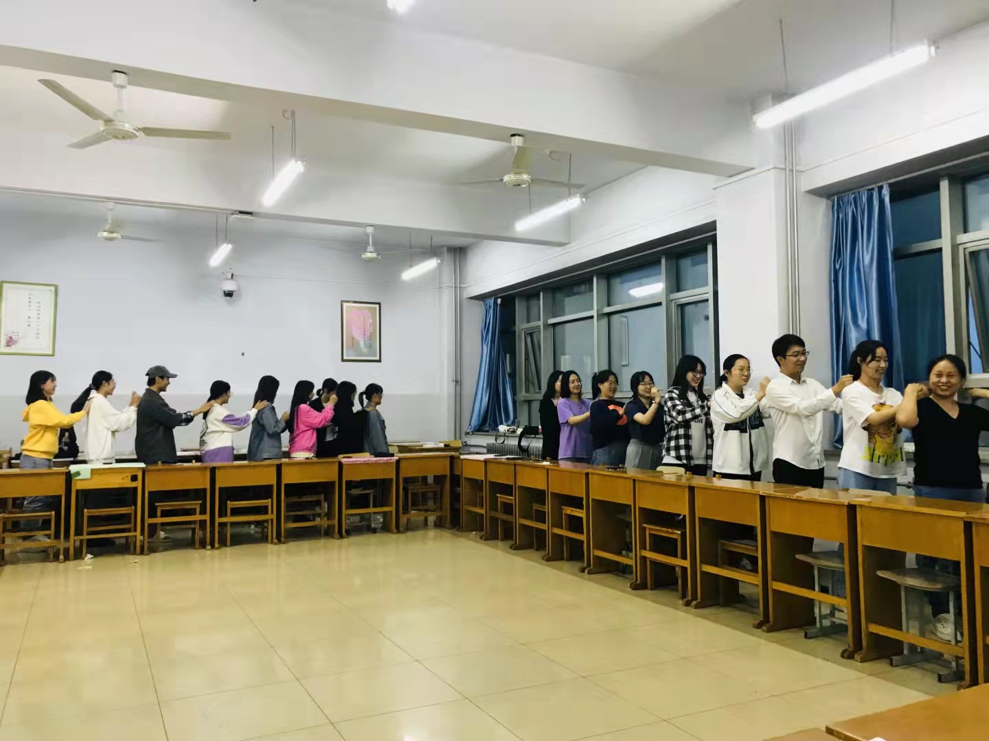 在活动开始之前,田老师安排了破冰热身小游戏。接着通过心理视频和团建游戏互动等环节,使参与的每一位同学打开心扉,树立积极的生活态度。学会在活动中和同伴携手解决问题,体验成功的喜悦,增强自信的同时释放压力。同时,激发、调整、升华、强化同学们的心理、身体、品德素质和潜能,使同学们心态开放稳定,更好地投入到学习生活中去。