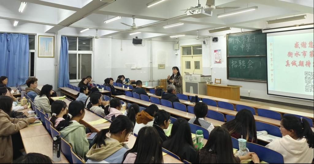 2024年4月11日晚,sunbet申搏官方网站在512教室举办了衡水市第十四中学专场招聘会,尹军胜副校长及随行老师到校开展宣讲。学院党委书记范群英、院长崔海英、党委副书记陆鸣、毕业班辅导员以及各年级在校生积极参与了此次活动。
