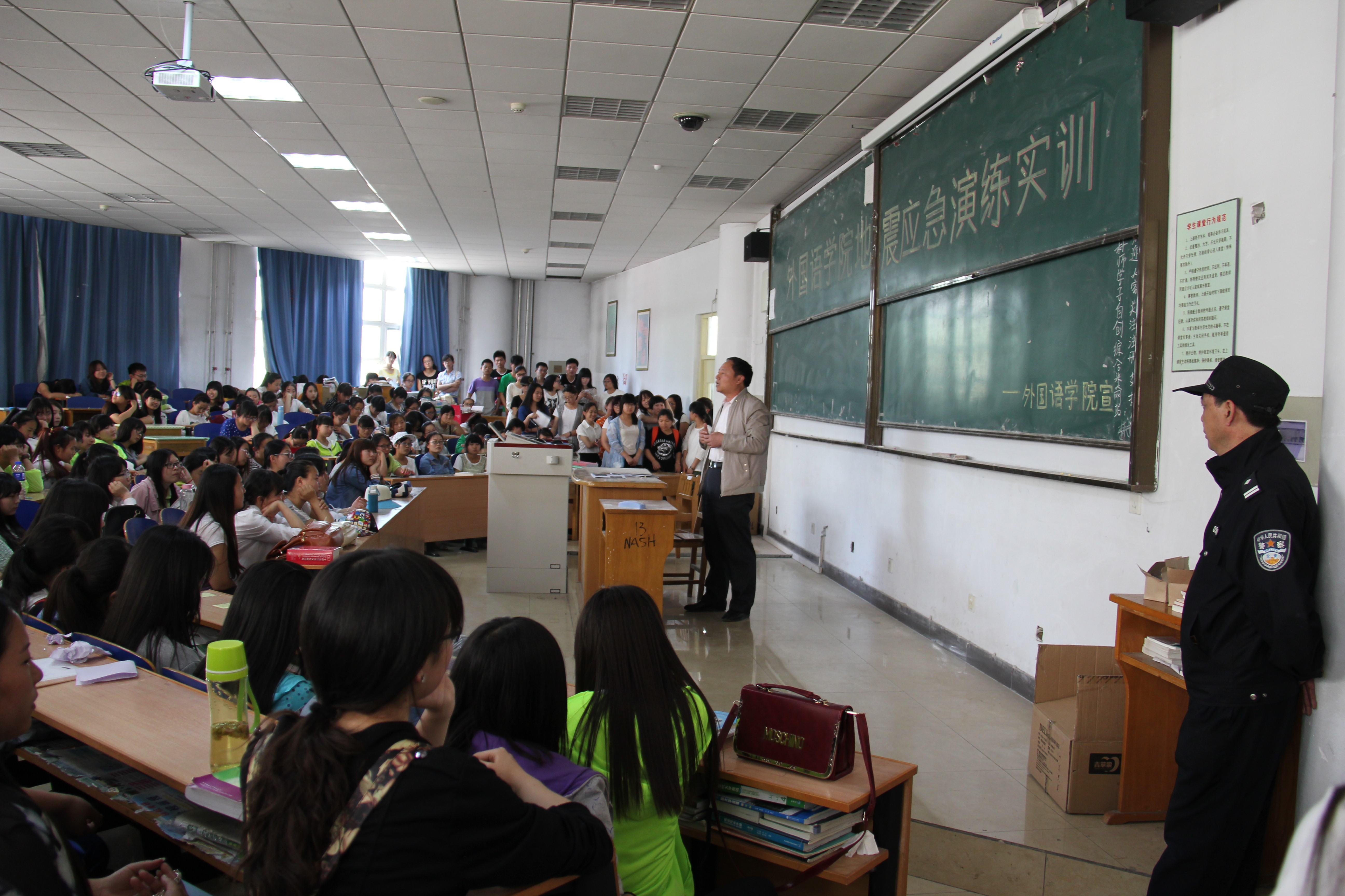 为落实学校《星级“平安校园”建设工作实施方案》,响应学校和保卫处关于开展地震应急演练活动的通知要求,sunbet申搏官方网站于5月21日中午集中进行地震应急演练和紧急疏散演习。活动邀请到保卫处副处长张明权老师和张明前科长对地震应急和紧急疏散的知识和技术要领进行培训。张明权老师首先详细讲解了学生处于教室、宿舍和公共场所时,如何观察周围环境,寻找避震场所和逃生通道。同时,对学生们进行自救和互救环节的要点进行了指导。之后,sunbet申搏官方网站地震应急演练正式开始。组织教师发出“发生地震了”的指令后,告知学生“地震了,不要慌,快避震”,要求学生保持镇静,头脑清醒,就近躲在安全的位置,并及时打开教室两侧通道。在短暂的避震后,组织老师指挥学生,分三个方向有序通过教学楼门口疏散逃生到楼外空旷的广场。最后,参加演练的班级清点人数后,宣布地震紧急演练结束。本次地震应急演练和紧急疏散演习不但提高了师生的安全意识,提高了大家安全防范意识和应对突发事件的能力。一名参加演习的学生活动结束后说,通过参加这场演习,让自己应对突发事件时有了一定的心理准备,听从现场指挥,及时寻找安全通道,并在自救的基础上实现互帮互救。