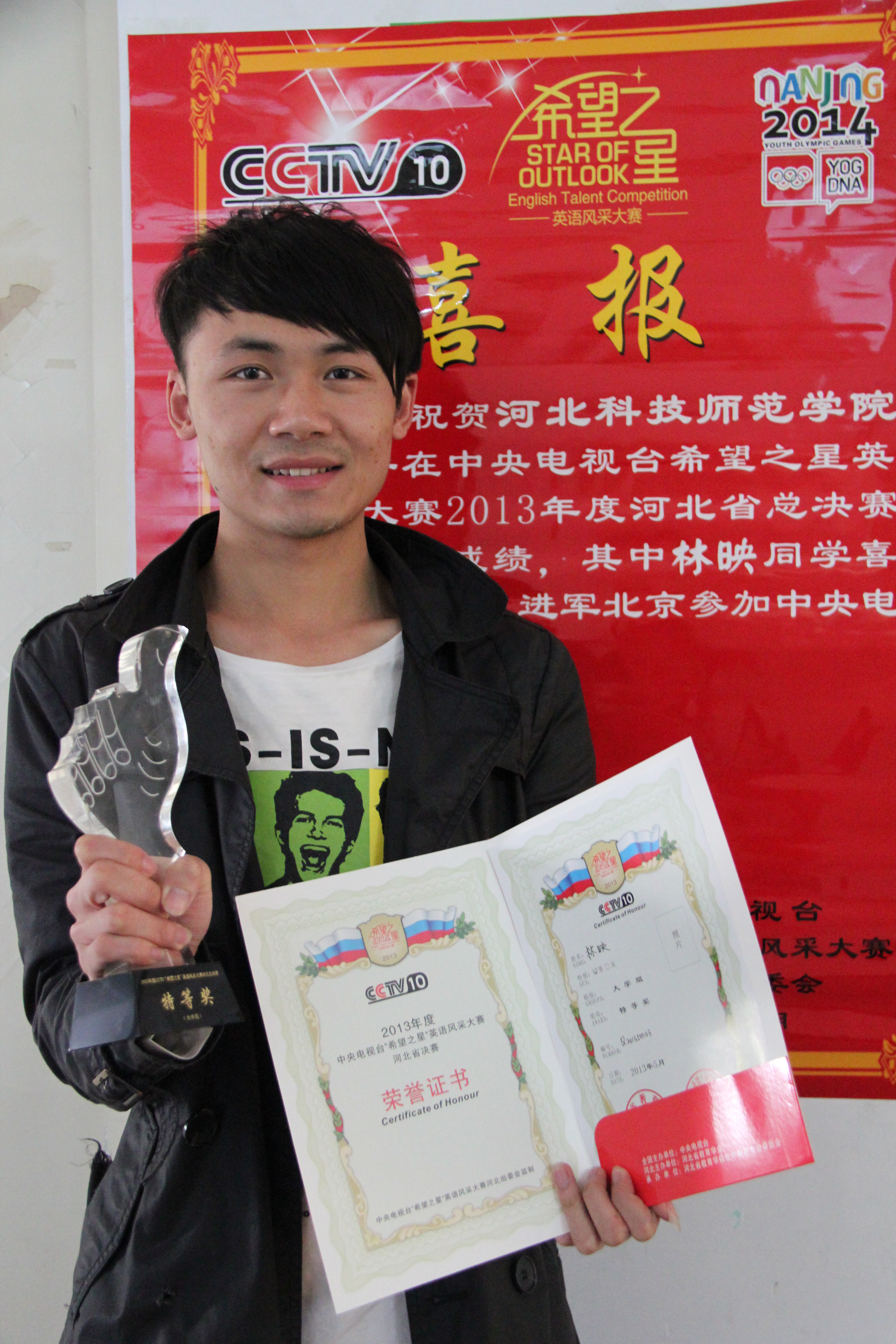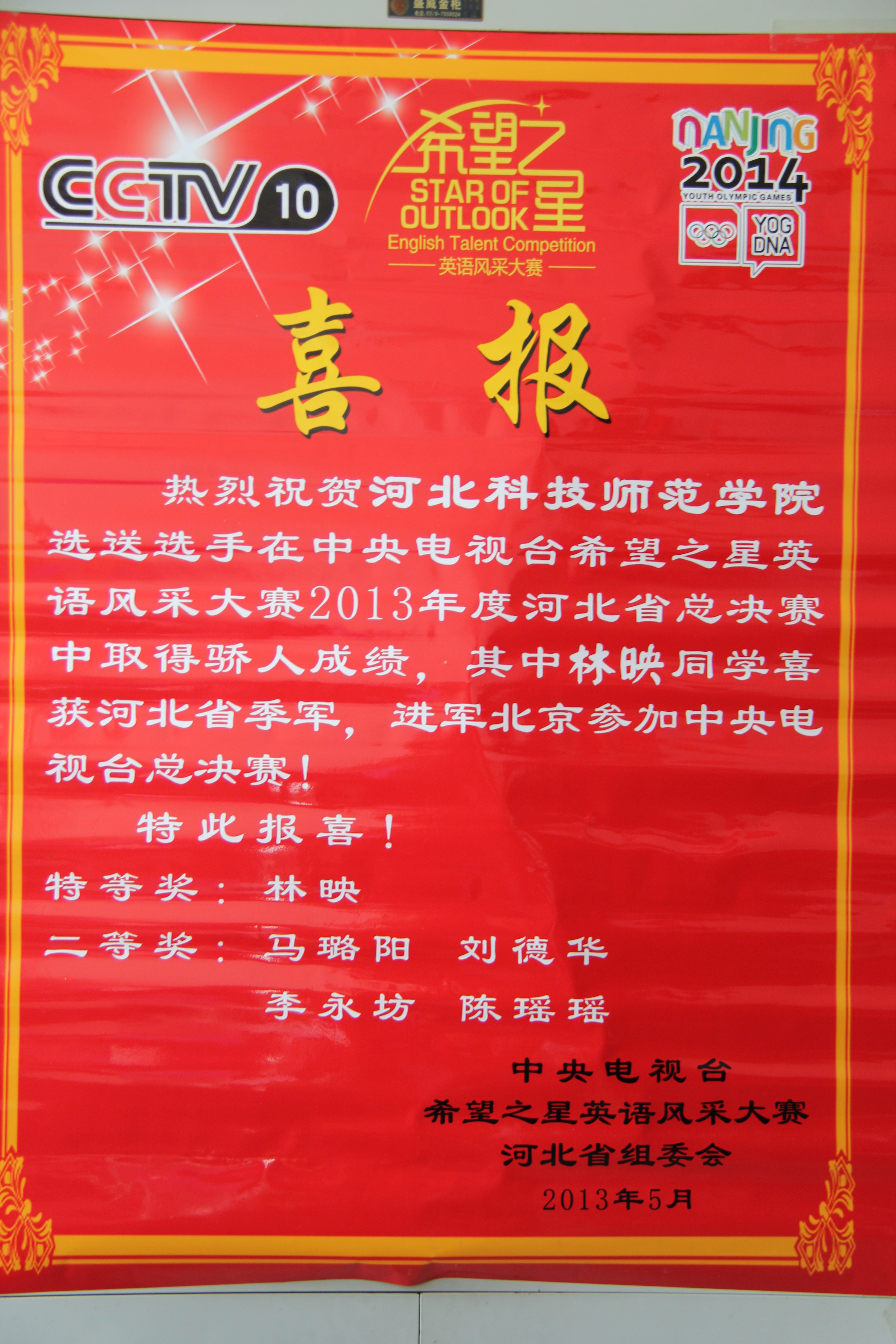 sunbet申搏官网选手在河北省希望之星英语风采大赛总决赛中表现优异,其中sunbet申搏官方网站学生林映获得河北省季军,将进军北京中央电视台参加总决赛。另有马璐阳、刘德华、李永坊、陈瑶瑶四名同学获得二等奖。