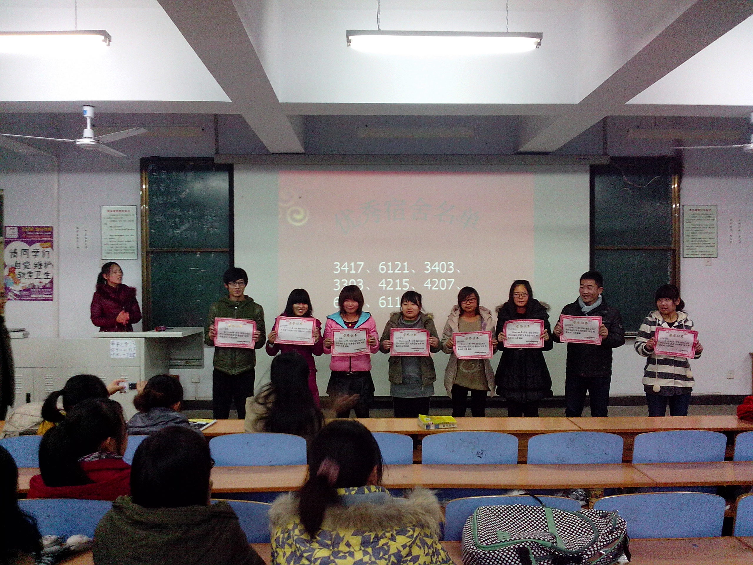 为了丰富校园文化活动,创造美好生活空间,进一步营造温馨舒适的宿舍文化生活环境,增强同学们之间的交流。2012年12月5日晚6:00,sunbet申搏官方网站在综合楼312举行了优秀宿舍表彰大会。sunbet申搏官方网站学工办田辉老师,各班班长、团支书、生活委参加了本次表彰大会。