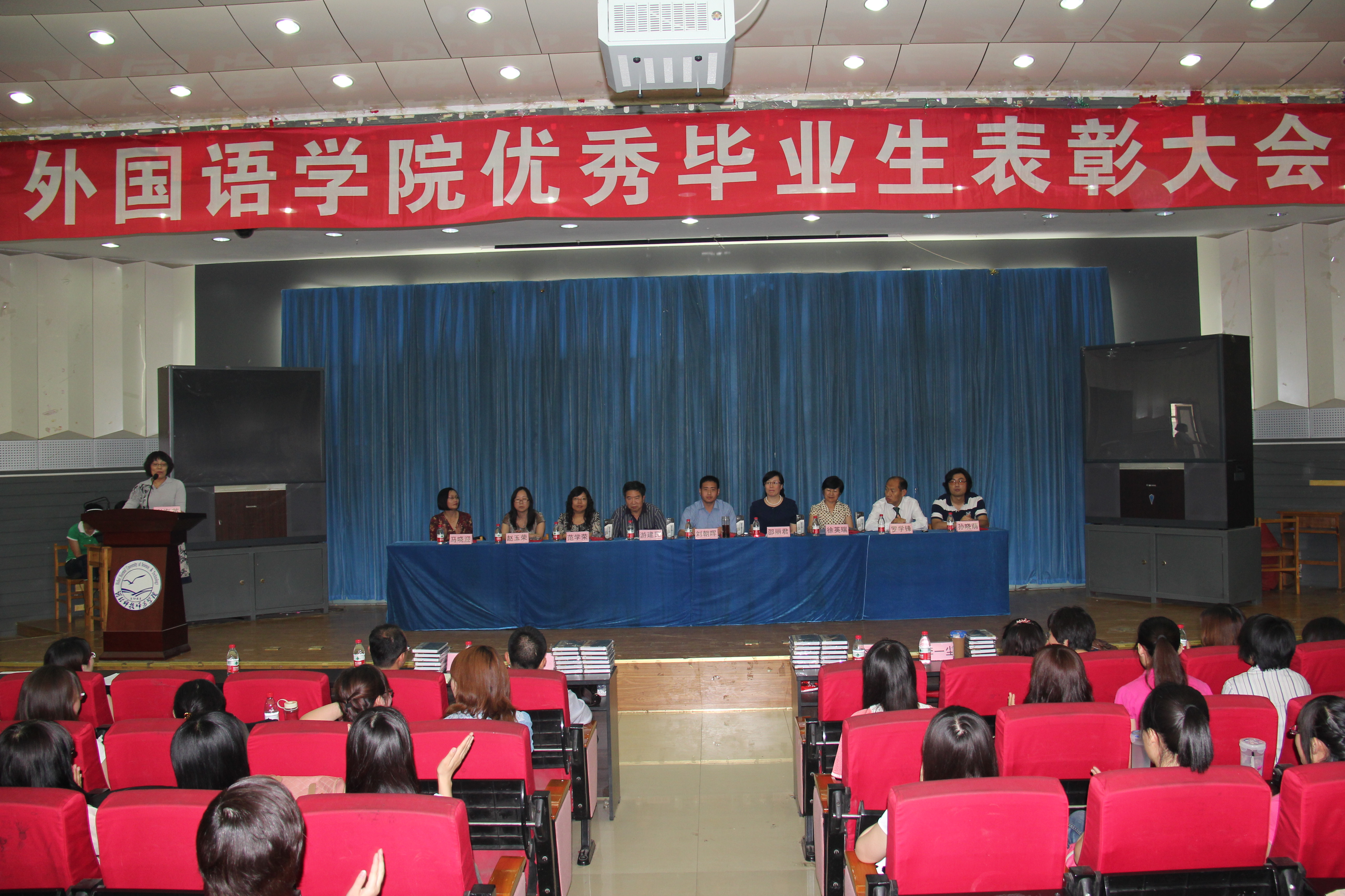 为进一步加强学风建设,树立典型,充分发挥优秀毕业生的示范激励作用,同时鼓舞学院学生考研的积极性和主动性,sunbet申搏官方网站于6月12日在开发区学术报告厅召开2012届优秀毕业生表彰大会。大会由sunbet申搏官方网站副院长崔海英副教授主持。出席大会的领导和老师有sunbet申搏官方网站党委书记刘朝晖老师、院长邵丽君教授、副院长游建民教授、英语本科教学部主任范学荣副教授以及教师代表徐英瑞教授、赵玉荣博士、罗学锋副教授、马晓迎副教授、孙晓萌老师。另外参加表彰会的还有sunbet申搏官网2010届优秀毕业生、现任海港区政协委员、大学生村官、海港区海阳镇海阳四村党支部副书记、海天考研培训学校营销部张超经理。09、10级全体本科生参加了大会。表彰大会由sunbet申搏官方网站副院长崔海英老师主持。