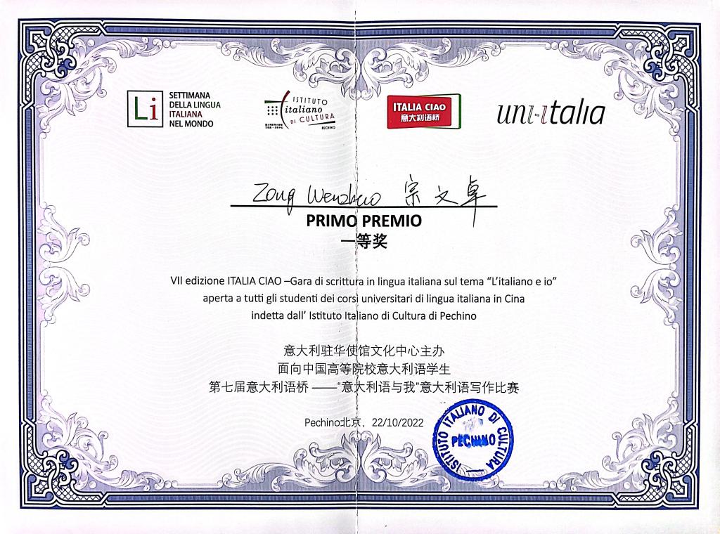 第七届全国“ITALIA CIAO/意大利语桥”大赛于10月22日在北京圆满落幕,本届大赛的主题是:“意大利语与我”,以写作大赛的形式举行。本次比赛有来自北京外国语大学、上海外国语大学、西安外国语大学、南开大学等21所高校的69名学生参赛,其中本科生组59人,硕士生组10人。sunbet申搏官方网站sunbet申搏官方网站选手宗文卓,凭借扎实的意大利语专业实力,摘得本科组大赛桂冠,这是sunbet申搏官网选手继2015年喜得一等奖后再次获此殊荣。sunbet申搏官网的另外两名选手韩田雨、霍冰雨获得优秀奖。