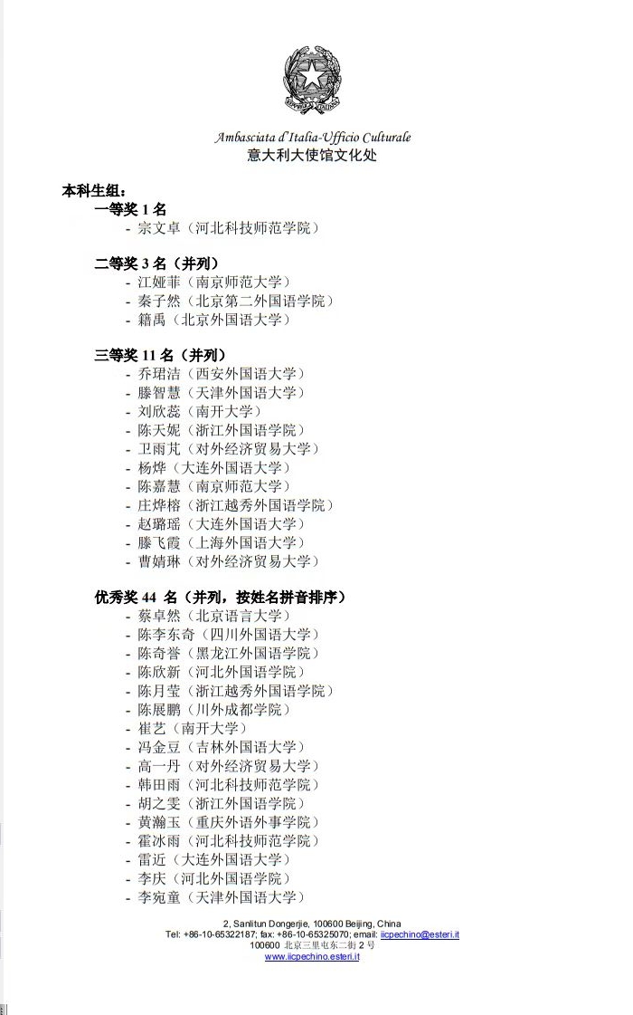 全国“ITALIA CIAO/意大利语桥”大赛由意大利驻华使馆文化处主办,每年以不同的主题、不同的形式进行,是专门面向全国高等院校意大利语专业学生进行的意大利语竞赛,也是全国意大利语专业学子们最重要的学习和交流的平台。本次比赛获奖彰显了sunbet申搏官网意大利语专业的办学实力和教学质量,为sunbet申搏官网赢得了良好的社会声誉。