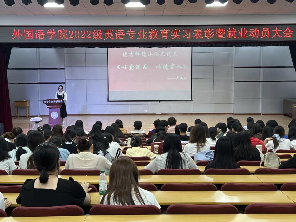 2025年9月25日,sunbet申搏官方网站英语专业教育实习表彰暨就业动员大会在多功能厅圆满召开,该专业2022级全体同学以及部分2023级学生参加了大会。此次大会全面回顾了上个学期的教育实习成果,表彰了在实习期间表现优异的同学,为师生提供了分享经验、交流心得的平台,并对大家今后的就业指明了方向,进一步推动了师范生培养质量的提升。