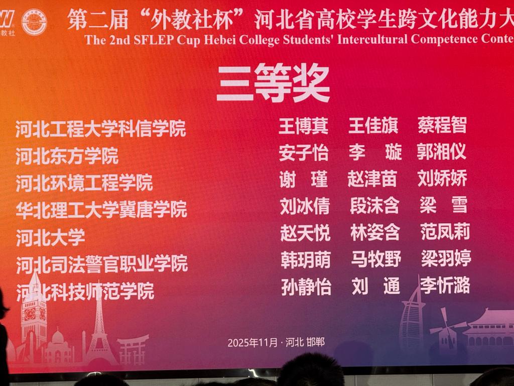 本次大赛由河北省教育厅主办,河北省高等学校外语教学指导委员会、河北省高等学校外语教学研究会、上海外语教育出版社和河北工程大学联合承办。未来,随着赛事体系的持续完善,必将培育更多兼具中国情怀与全球胜任力的优秀人才,为深化人类文明交流互鉴贡献青春力量。(编辑:王小琳 校对:王静 审核:崔海英)